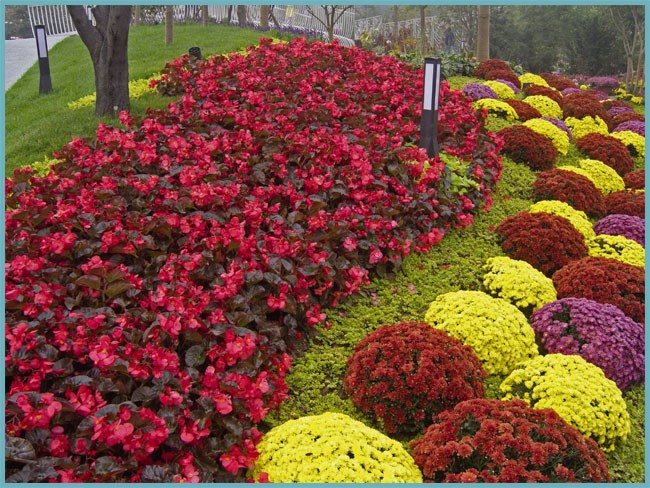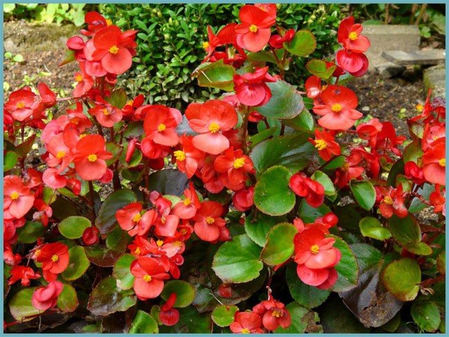 Посадки бегоний с низкорослыми кустарниками, обеспечивающими растению некоторую тень, также прекрасно украшаю территорию.