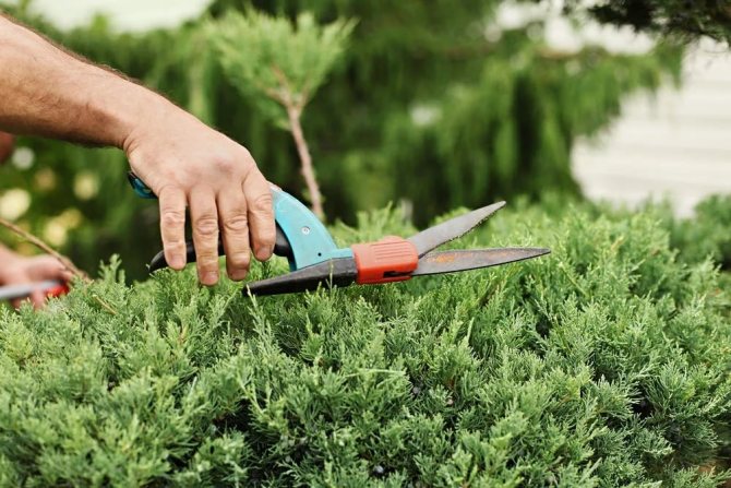 Важно! Не стригите можжевельник как живую изгородь, а удаляйте только 30–50% верхушек молодых побегов, но не более 70% общей массы, чтобы не нарушать внутренние обменные процессы растения и не ослабить его.