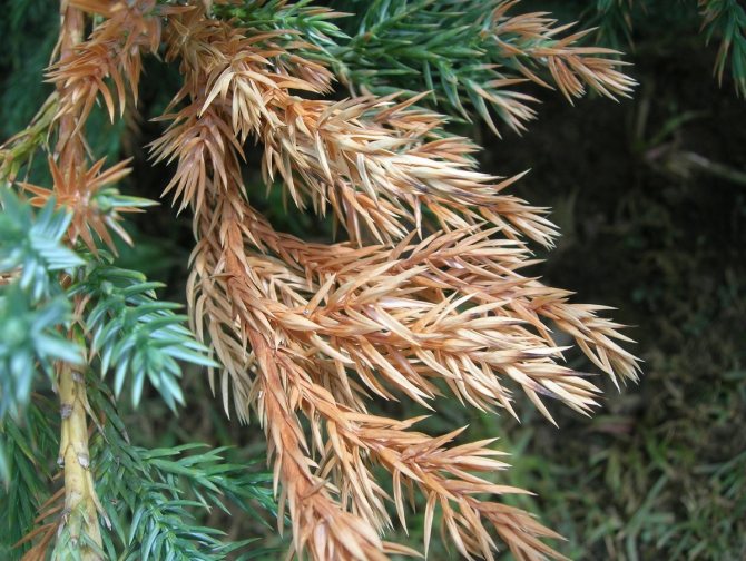 Заболевание кустарника ржавчиной в первую очередь отражается на хвое