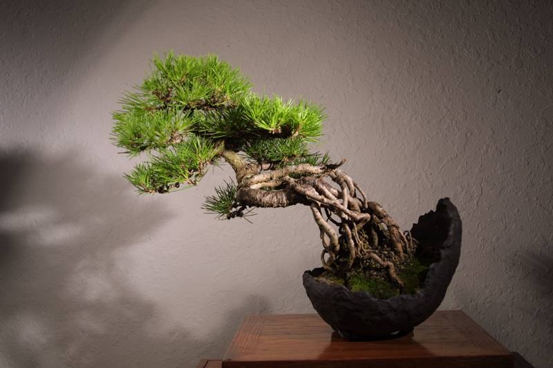 - В первом из них саженец высаживается в ёмкость, стенки которой ограничивают разрастание корневой системы. Первый год сосна приживается на новом месте, а на следующий сезон по весне у неё удаляются ветки, растущие внутрь дерева, а остающиеся ветви укорачиваются на четверть. Все хвоинки делаются наполовину короче для стимуляции роста новых побегов. На следующий сезон весной сосна пересаживается в новый, более просторный, горшок с одновременным укорочением центрального корня на четверть и обрезкой чрезмерно разросшихся боковых корешков. Хвоя опять укорачивается вдвое. На четвёртый год дерево высаживается под открытое небо.