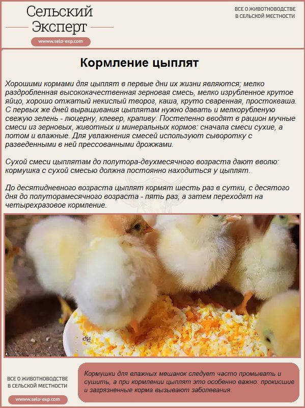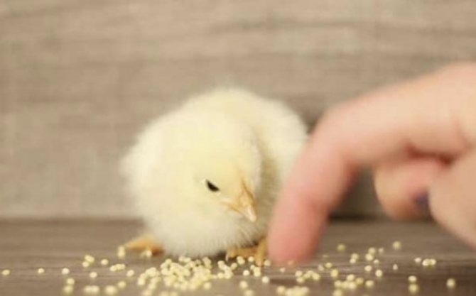 Цыплят кормят не так как взрослых особей. Появившихся на свет цыплят кормят как минимум 5-6 раз в сутки. В первые дни молодняк кормят только варенным, хорошо измельченным яйцом. С третьего дня в рацион цыплят можно включить другие продукты: