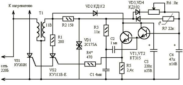 На рубеже восьмидесятых годов, когда готовые изделия были в дефиците, пользовались популярностью самоделки, особенно радиолюбительские. Вот одна из простейших схем терморегулятора того времени.