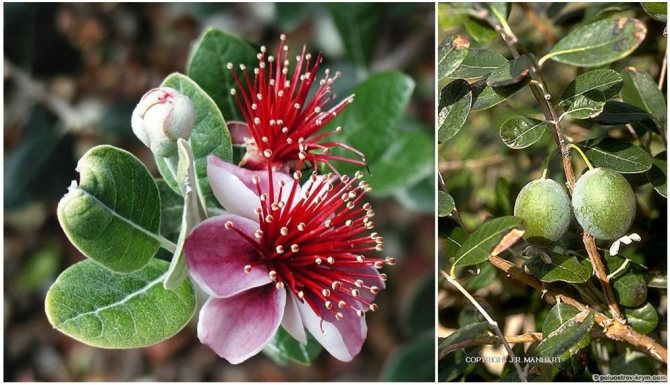 У молодых растений ветви были серовато-желтые, с вечнозелеными кожистыми листьями, сверху темно-зелеными, а снизу серебристо-опушенными, с ароматическими железками. На пятом или шестом году в июне-августе на них появились одиночные, крупные, до 4 сантиметров в диаметре, красивые цветы с толстыми красновато-белыми лепестками и длинными красно-пурпуровыми тычинками. Зеленоватые многосемянные плоды растения (весом до 30-100 граммов) напоминали огурцы. Мякоть у них сочная, кисловатая, с оригинальным своеобразным вкусом, тонким ананасно-земляничным ароматом.