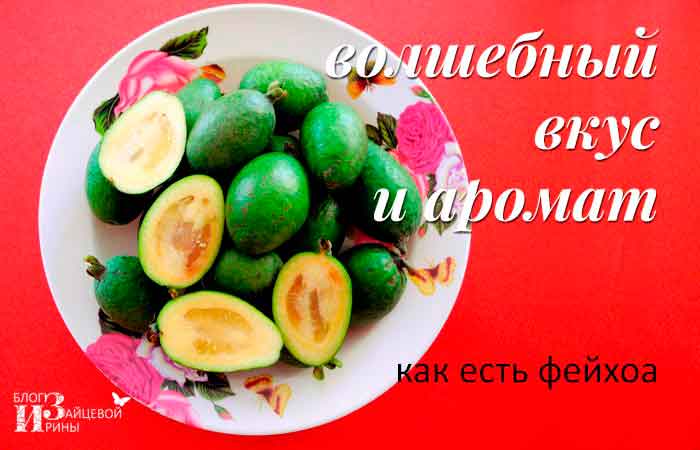 Фейхоа обычно собирают недозрелыми, т.к. при этом ягоды не травмируются при транспортировке и прекрасно дозревают (как зеленые помидоры). Покупать лучше, конечно, зрелые плоды, на ощупь они мягкие. Но если купили твердые, то ничего страшного – через несколько дней они дозреют (главное, чтобы в помещении не было душно, иначе фейхоа может загнить). Для того чтобы купить действительно хорошее фейхоа, лучше не постесняться и попросить разрезать один. У зрелого плода мякоть прозрачная. Если белая и непрозрачная – фрукт недозрелый, а если коричневая – испорченный. Мякоть фейхоа обладает очень приятным, нежным землянично-ананасовым вкусом и ароматом. При этом кожица на вкус терпкая, немного вяжет, но в целом довольно съедобна. Кто-то любит есть фейхоа целиком, срезав только хвостик. Другие разрезают ягоды пополам и вычерпывают ароматную мякоть ложечкой.