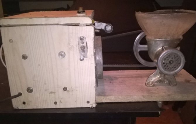 После того, как механизм собран, для удобства работы с ним к отверстию, оставшемуся в бывшей мясорубке, приваривают ёмкость в виде воронки, в которую будут закладывать сырьё. Готовую конструкцию запускают, отслеживая работу всех деталей, натяжение ремня.