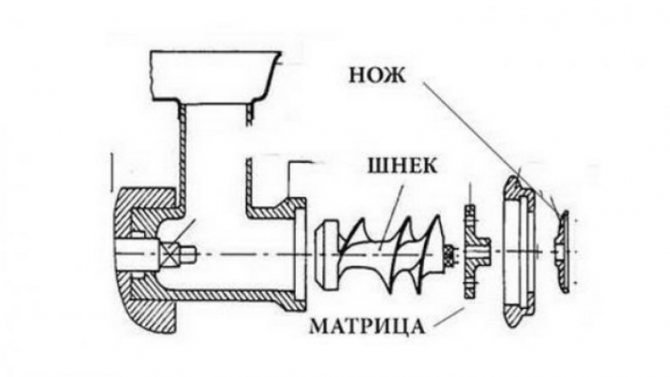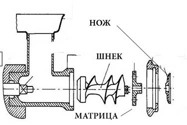 В шнеке мясорубки просверливают отверстие под крепление для ножа, крепят нож с помощью болта с наружной стороны матрицы.