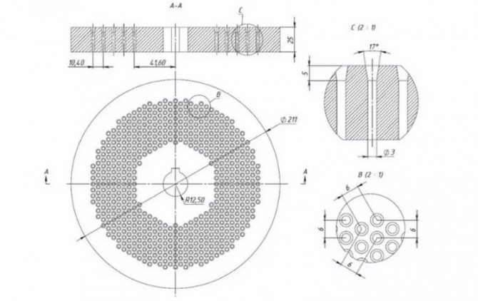 Для создания чертежа на основе мясорубки следует снять все необходимые размеры, особенно важны параметры сетки, так как матрица изделия должна соответствовать им.