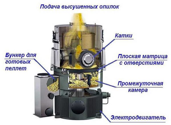 Принцип работы гранулятора – использование давления, когда измельченный материал зажимается между вращающейся поверхностью матрицы и пресс-вальцом