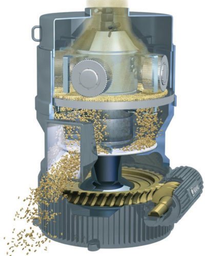 . Матрица при вращении сбивает горсть сырья к пресс-вальцам, которые, в свою очередь, проворачиваются. Масса зажимается в клинообразном пространстве между двумя поверхностями, уплотняется и проходит через ячейки матрицы.