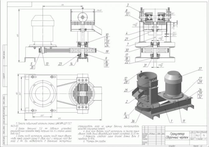 Так как гранулятор предназначен для получения гранул небольших размеров (диаметром до 14 мм), в основу его конструкции заложен самый рациональный вариант с точки зрения металлоемкости, простоты конструкции и удобства обслуживания — вращающаяся кольцевая матрица с горизонтальной осью вращения и два вальца, вращающихся внутри нее на неподвижных осях. Матрицы приводятся в движение от электродвигателя. Одновременно за счет трения вращаются и прессующие вальцы.