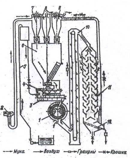 Гранулы, выходящие из пресса, направляются в охладитель 7. Здесь через слой гранул вентилятором 1 прокачивается воздух, который охлаждает гранулы и одновременно отсасывает часть несгранулирован- ной муки и крошку. Они оседают в циклоне 2 и выводятся в дозатор 3 для повторного гранулирования.