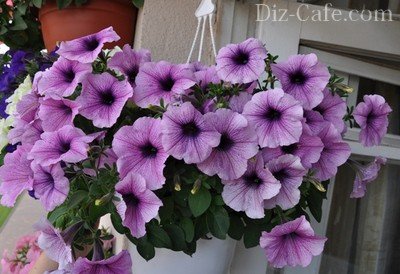 - Ампельная петуния растет каскадом с ориентированными вниз цветками. Сорта этой петунии зачастую выращиваются в горшках на улице (см. фото). К ним относят Сурфинию, Пират, Рендула, Лавина.