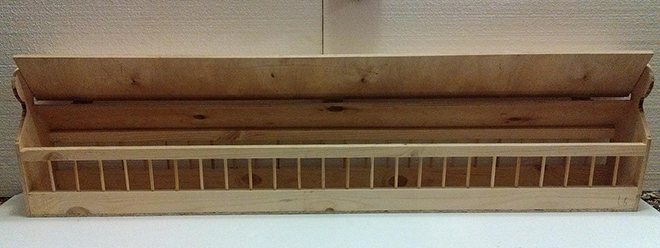 Такая кормушка представляет собой сбитый лоток с высотой бортиков до 6 см. Для надёжного перемещения кормушки по всей длине крепится рейка. Высота составляет 14 см.