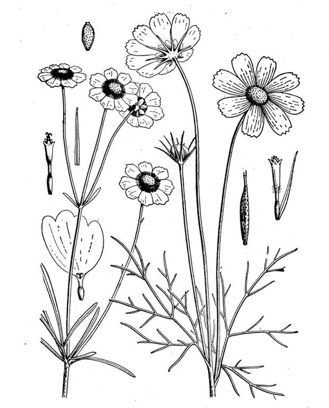 Растение космея достигает в высоту от 50 до 150 см. Стебли у нее тонкие, гибкие, прямостоячие и разветвленные. Листья супротивные, дважды рассеченные, ажурные, изящные. Соцветия-корзинки, похожие на ромашки до 12 см в диаметре, растут одиночно или собраны в рыхлые щитковидные метелки. Срединные цветки в корзинках мелкие, трубчатые, желтоватые, а язычковые – крупные, пурпурового, розового, красного, белого, золотисто-желтого оттенка.