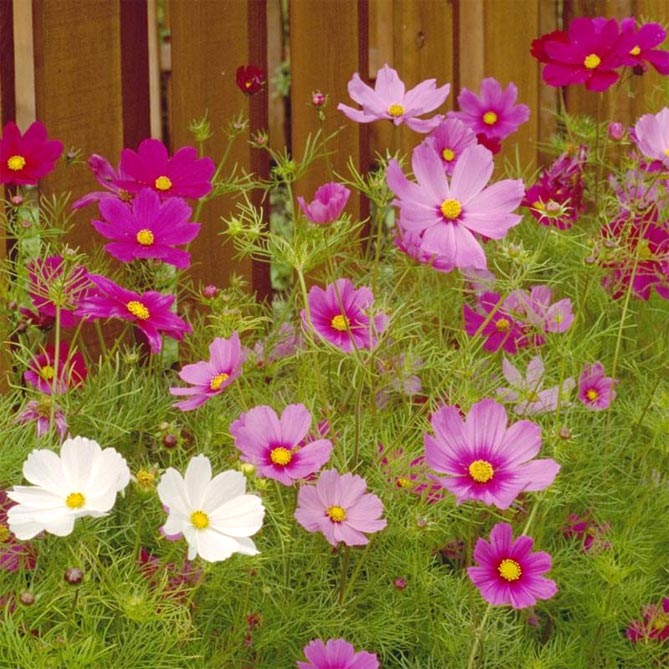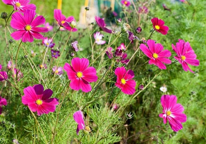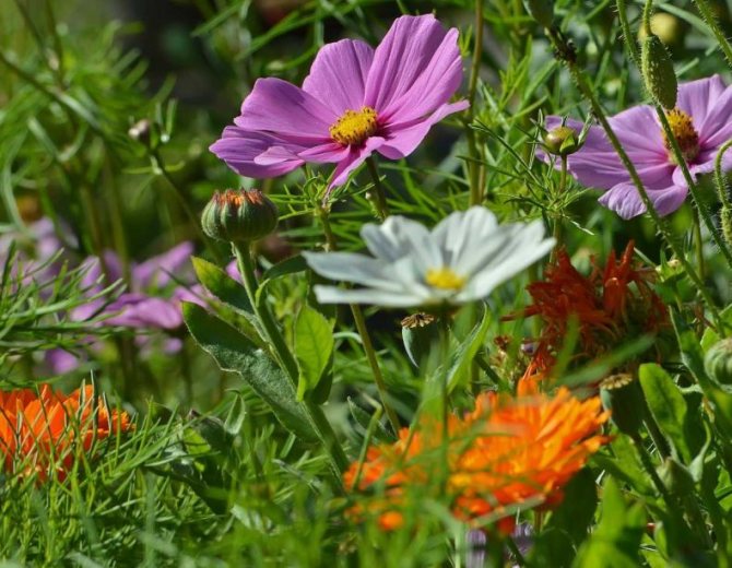 - Соседство с другими цветами. Космея хорошо уживается с другими видами растений. Однако для создания эстетичного цветника высокорослую космею нужно высаживать позади остальных цветов.
