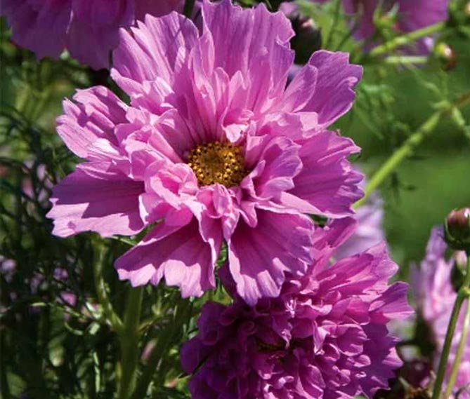 Цветы космеи сорта «Дабл клик», напоминающие цветок садовой розы
