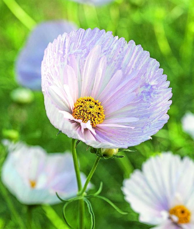 Космея дваждыперистая (Bipinnatus) – однолетнее растение. Вырастает до 1-1,5 метров в высоту, мощно разрастается и на верхушках многочисленных стеблей образуются деликатные цветы диаметром 5-9 см. Высота очень сильно зависит от позиции – в слегка затененных положениях растение не может вырасти до 1,5 метров.