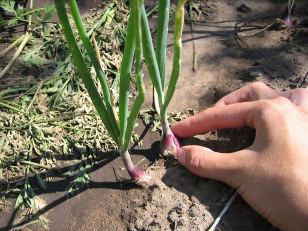 За пару недель до сбора урожая рекомендуется убрать землю от луковиц или же произвести обрезку корней. Но первый вариант легче выполним, поэтому предпочтительнее. Обычно период сбора лукового урожая приходится на начало августа-начало сентября в зависимости от погодных условий конкретного региона.