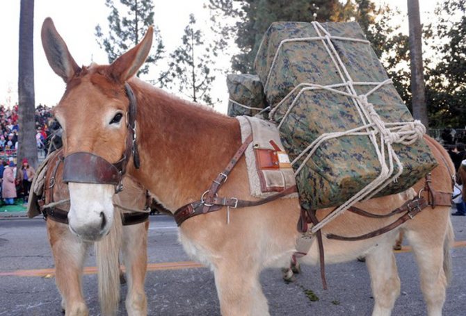 Интересно! Белые или чалые представители встречаются редко. Пегие мулы получаются только в том случае, если кобылы были пятнистыми. Исторически так сложилось, что мулов активно использовали в армии – это транспорт для перевозки тяжелых грузов, людей, военной техники.