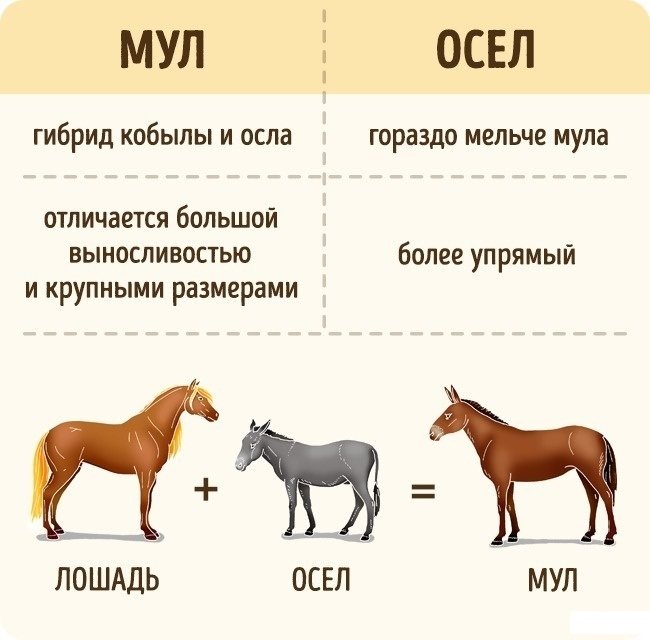 Чтобы представить, как выглядит мул и чем он отличается от родителей, взгляните на следующую иллюстрацию.