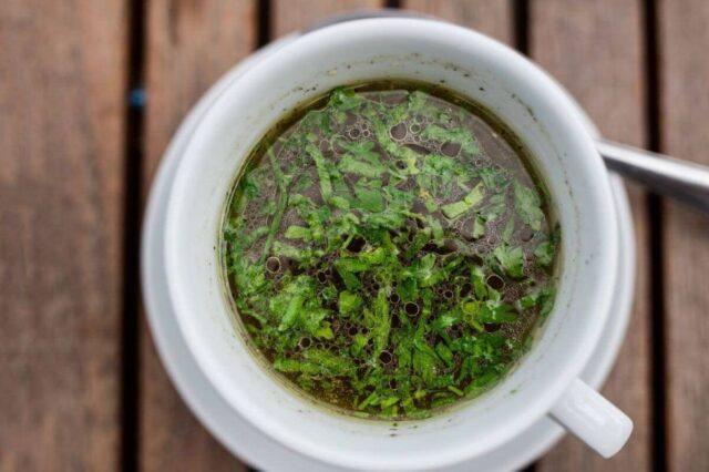 - Тщательно измельчают зелень растения в количестве двух маленьких ложек.