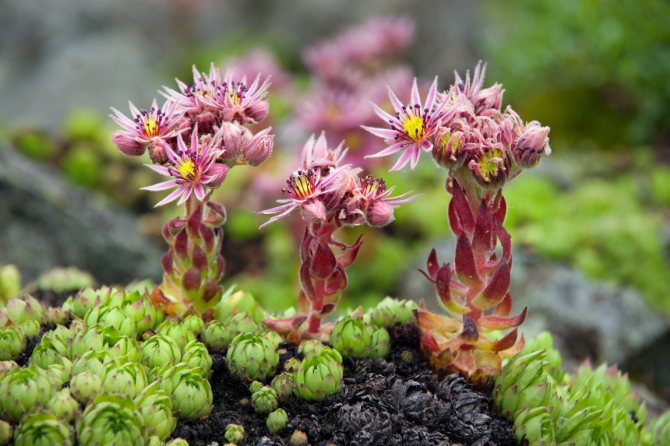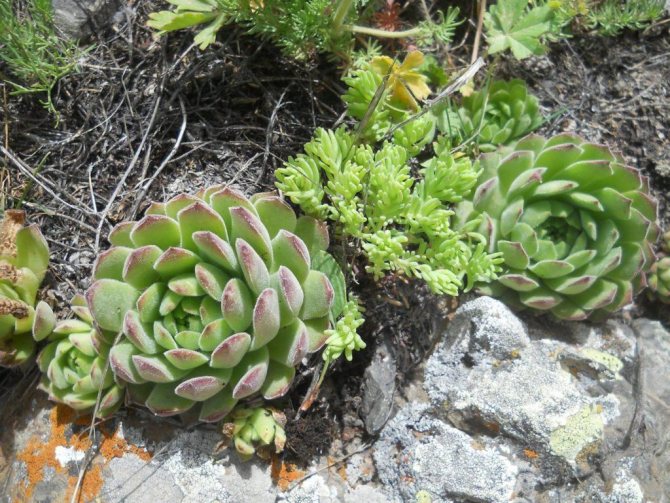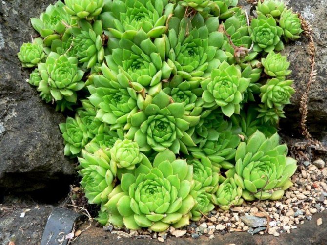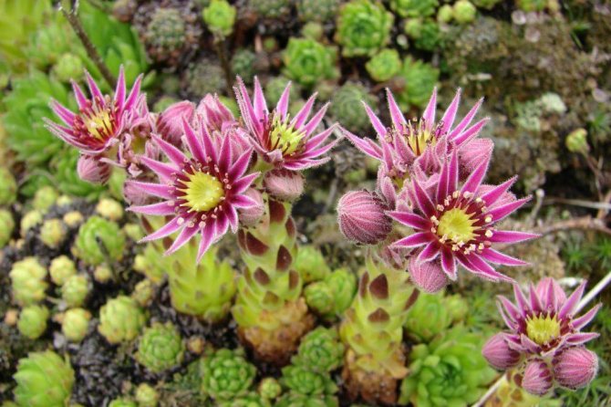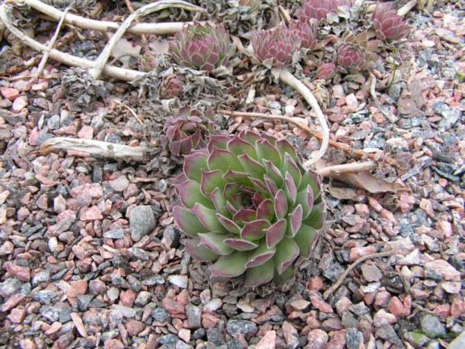 Обильно разросшееся молодило с многочисленными дочерними розетками