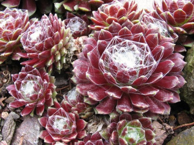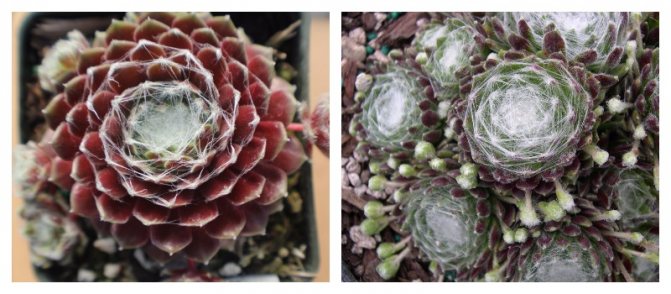 - Паутинистое. Название этот цветок носит не зря. На кончиках крошечных розеток, размером всего в 3 сантиметра растут тонкие ворсинки, напоминающие паутину. Преимущественно обитает в горных районах.