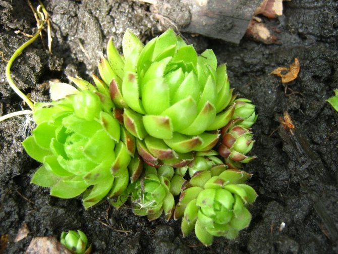 Всходы каменной розы — небольшие и, как может показаться, некрепкие, но в осеннюю пору они, несомненно разрастаются, и на второй год жизни подрастающее поколение сможет похвастаться первыми вегетативными отростками.