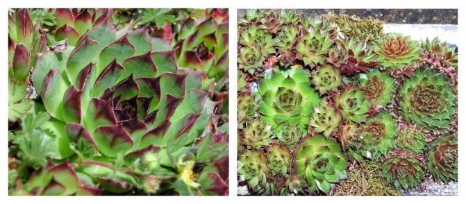 Молодило мраморное. Его пестрые листья украшают зеленые и красные разводы (хотя есть сорта, у которых розетка к зиме становится почти полностью красной), на молодых листьях есть легкое опушение, но со временем, подрастая, листья становятся абсолютно гладкими. Цветок с красноватыми лепестками со светлой окантовкой по краям.