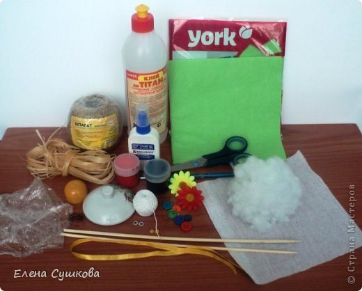 Материалы: шпагат джутовый; салфетка хозяйственная; белая хлопчатобумажная ткань 18х18см; наполнитель — холлофайбер; нитки «Ирис»; лыко; клей «Титан»; клей ПВА; две деревянные шпажки; искусственный цветок; пара декоративных глазок; разноцветные пуговицы; две половинки гороха; красная и чёрная акриловая краска; узкая атласная ленточка; половинка капсулы от «Киндер-сюрприза»; крышка от сахарницы; пищевая плёнка; тонкая проволока; контур по ткани или гелевая ручка, розовая пастель или школьный мелок.