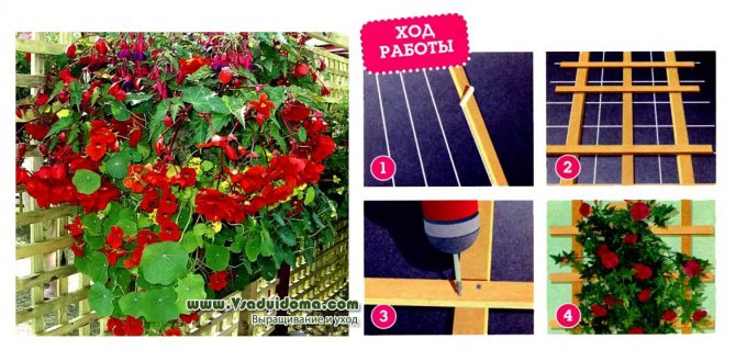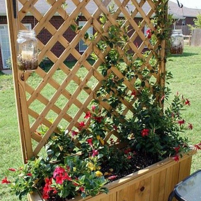 4. Готовую решетку лучше покрасить краской, чтобы конструкция не выцветала и не темнела от дождя. Такую решетку можно саморезами закрепить у стены дома или беседки. Еще вариант -прикрепить ее к столбам или другим опорам в саду.