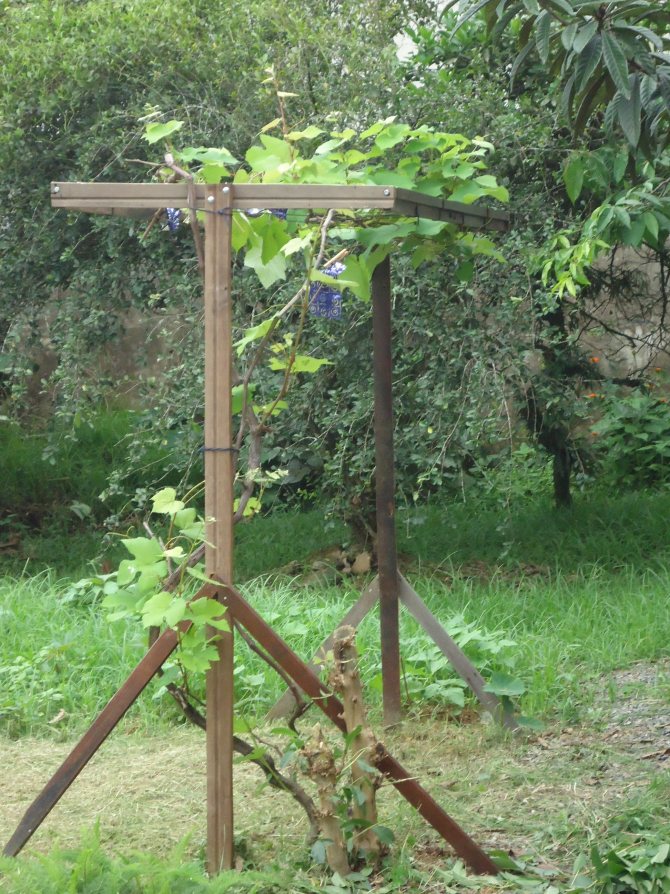 Дополнением может стать опора горизонтального типа, по которой будет плестись виноград. Также такие опоры, увитые цветками, могут стать отличными помощниками для организации площадки для летнего отдыха.