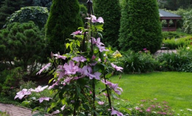 И только в последнюю очередь стоит обращать внимание на внешнюю привлекательность. Выбирать подпорку стоит в зависимости от того, в каком стиле оформлен сад. Для небольшого японского садика подойдут бамбуковые подпорки, а вот для площадки, оформленной в классическом стиле, лучше выбирать изысканные металлические столбцы, украшенными коваными вставками.