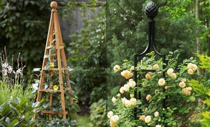Первые выглядят эстетически хорошо даже без цветов. Что актуально в осеннее и зимнее время, когда растения сбрасывают листву. К декоративным вариантам следует отнести арки, сетки, садовые экраны, башни, решетки. Вторые – предназначены исключительно для поддержки. Выглядят они не особо привлекательно. Но зато являются надежными и прочными. Такими опорами могут быть сетка или проволока.