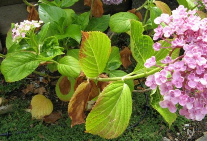 Когда у гортензии сохнут края листьев и их кончики, то можно с большой долей уверенности сказать, что имеет место полив жесткой водой или растение «горит» под открытыми солнечными лучами.