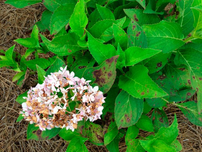 Надземная часть гортензии покрывается темно-красными пятнами, превращающими листья и побеги в некрозную массу, выдающую пылевые выбросы спор.