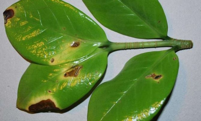 Антракноз поражает замиокулькас, желтеют листья в том числе и от него