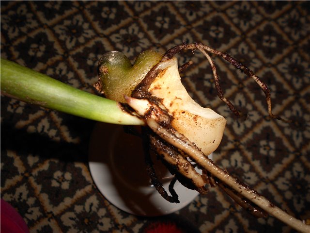 - Следует вынуть растение из горшка, внимательно осмотреть его клубень на предмет наличия гнили. Загнившие корни удаляются острым ножом.