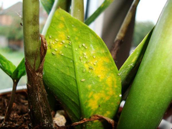 Вредители часто приводят к пожелтению листвы замиокулькаса. Что делать, если на растении появились вредители? Сначала нужно определить их характер, вид, а затем уничтожить посредством механического метода, а также опрыскиваниями инсектицидами.
