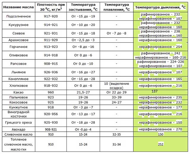 Этот показатель указывает, при какой температуре масло на сковороде начинает дымить. Не стоит им пренебрегать, так как дымящееся масло содержит канцерогены, вызывающие онкозаболевания. У каждого масла своя точка дымления. Чем выше этот показатель, тем более масло подходит для жарки. Вот таблица с некоторыми значениями: