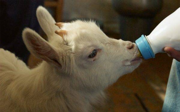 Молочную смесь разогревают до +38 градусов и выпаивают козленку при помощи бутылок с сосками или емкостей небольшого размера (мисочка, кастрюлька).