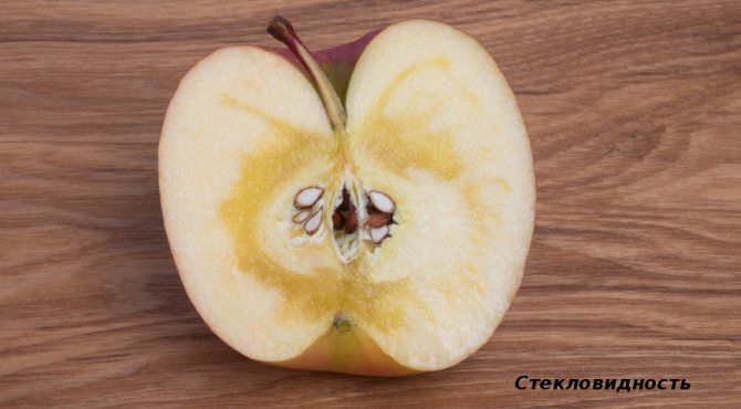 Физиологическое заболевание плодов – стекловидность, характеризуется наличием прозрачных, содержащих много воды участков в мякоти яблок. Межклеточные пространства до отказа заполнены клеточным соком.