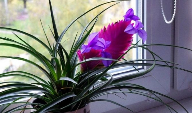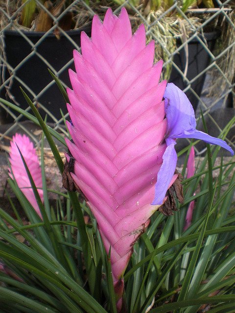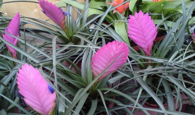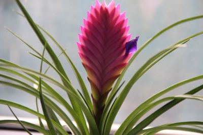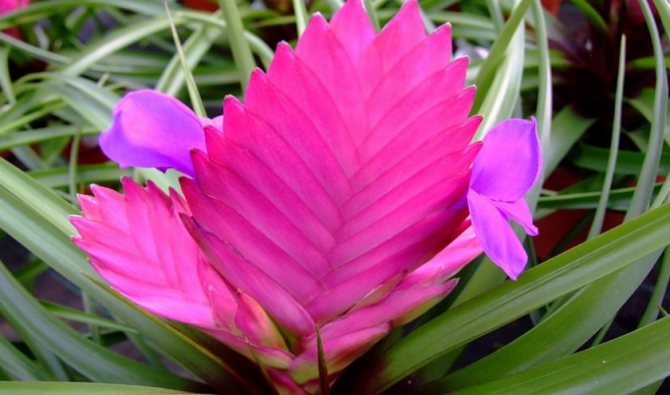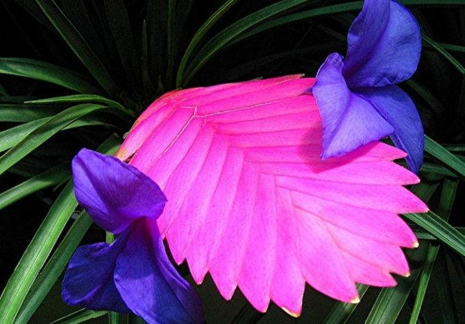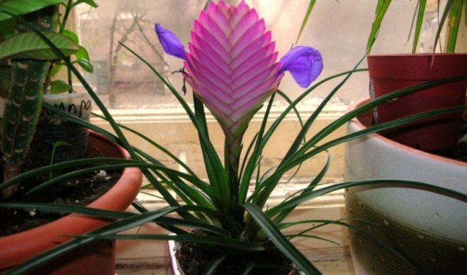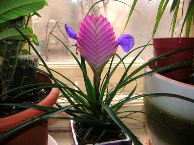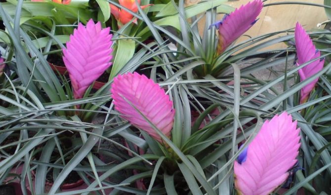 Тилландсия Синяя (Цианея) — это наиболее популярный цветок для ухода в домашних условиях. Он формирует причудливую розетку из злаковидных листьев, окраска которых меняется от красноватого основания до буро-полосатых пластин. Высота розетки достигает 30 см. Летом из центра розетки вырастает плоский колос с плотными прицветниками, расположенными в виде причудливого орнамента. Фантастическая окраска и форма прицветников кажутся искусственными. Синие или голубенькие цветочки с ромбическими, отогнутыми в стороны лепестками, распускаются постепенно, по колосу как бы прокатывается волна от его верхушки до основания. Прицветники окрашены в ярко-сиреневые или розовые тона.