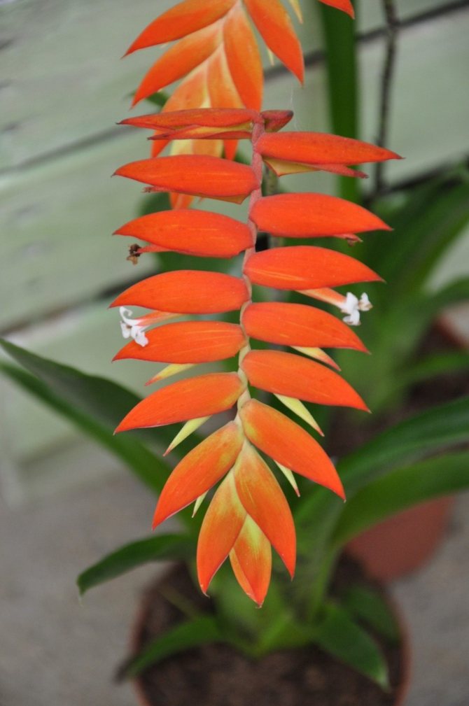 Узкие, длинные, зеленые листья образуют розетку. Декоративной ценностью растения являются живописные, трубчатые прицветники насыщенного красно-оранжевого цвета.
