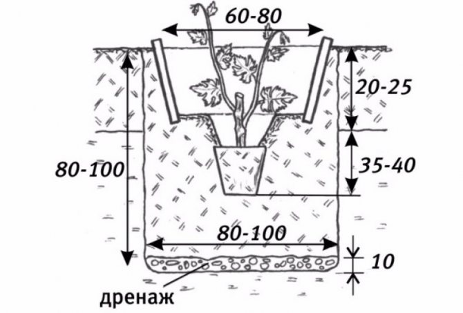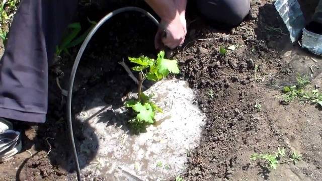 - Прогретую почву высыпают в яму накануне посадки черенка. Делают посередине небольшое углубление (около 30 см) и туда высаживают виноград.